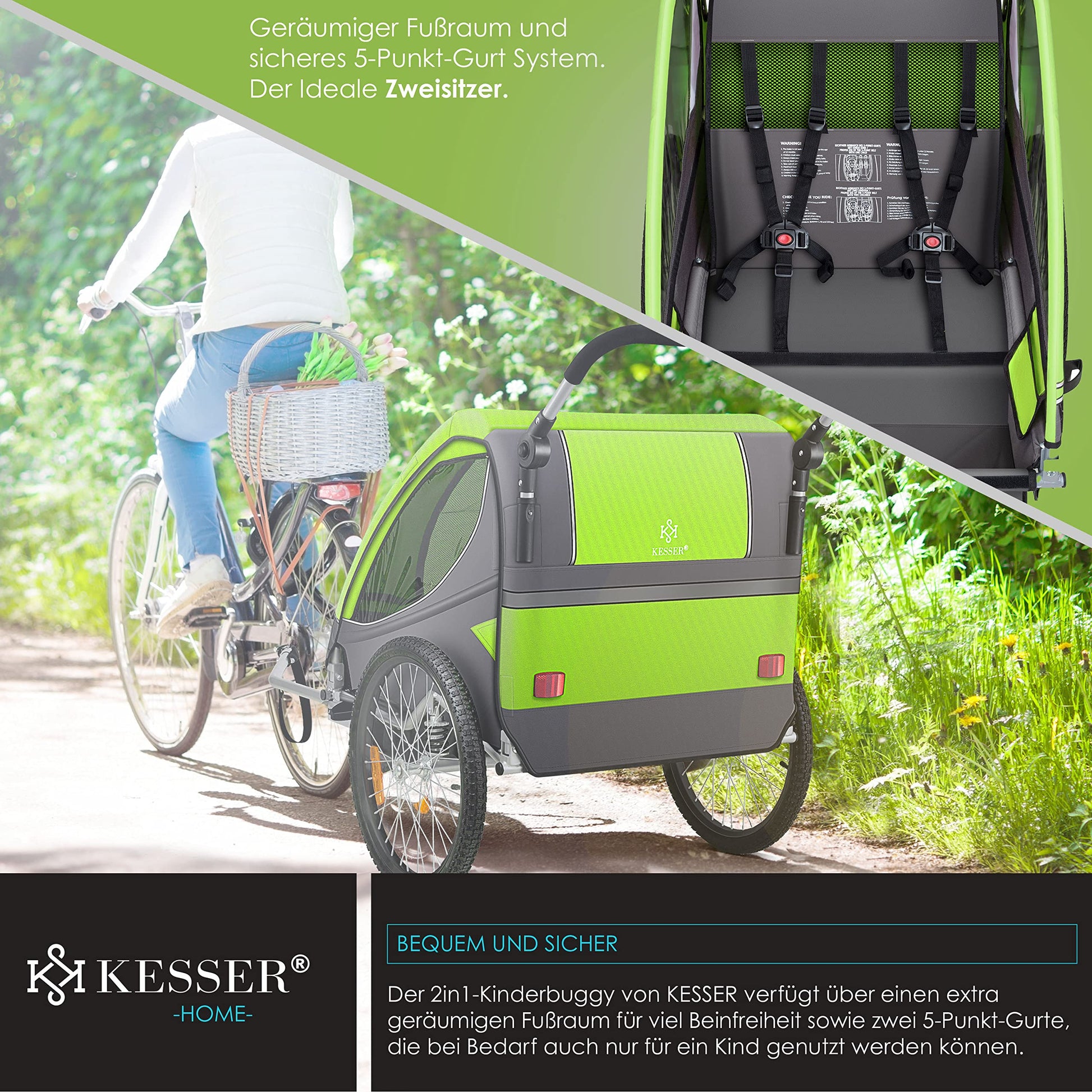 • 𝐒𝐈𝐂𝐇𝐄𝐑𝐇𝐄𝐈𝐓: Reflexstreifen und Reflektoren Vorne, Hinten sowie am Aufbau garantieren eine optimale Sichtbarkeit im Straßenverkehr. Die Parkbremse sowie das 360°-Vorderrad machen den Fahrradanhänger besonders leicht zu manövrieren und geben Ihnen die Kontrolle, die Sie benötigen. Der klappbare Griff macht den Transport noch einfacher. Das 5-Punkt Gurtsystem bietet maximale Sicherheit und Komfort für Ihre Kinder, damit sie nicht verrutschen oder fallen können.